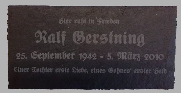 Die Gravur auf der Schiefertafel mit einem Hochleistungslaser eingebrannt. Das Format der Platte beträgt